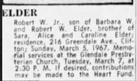 Robert W. Jr., Son of Barbara W. and Robert W. Elder, brother of Sara, Alice and Caroline Elder; residence. 216 Greendale Ave., Clifton; Sunday, March 5, 1967. Memorial services at the Glendale Presbyterian Church, Tuesday, March 7, at 2:30 P.M. If desired, contributions may be made to the Heart Fund. https://www.ancestry.com/discoveryui-content/view/3351338:5763?tid=&pid=&queryId=23f78861613ef8dfd149cb96be4d2dcf&_phsrc=idQ28&_phstart=successSource